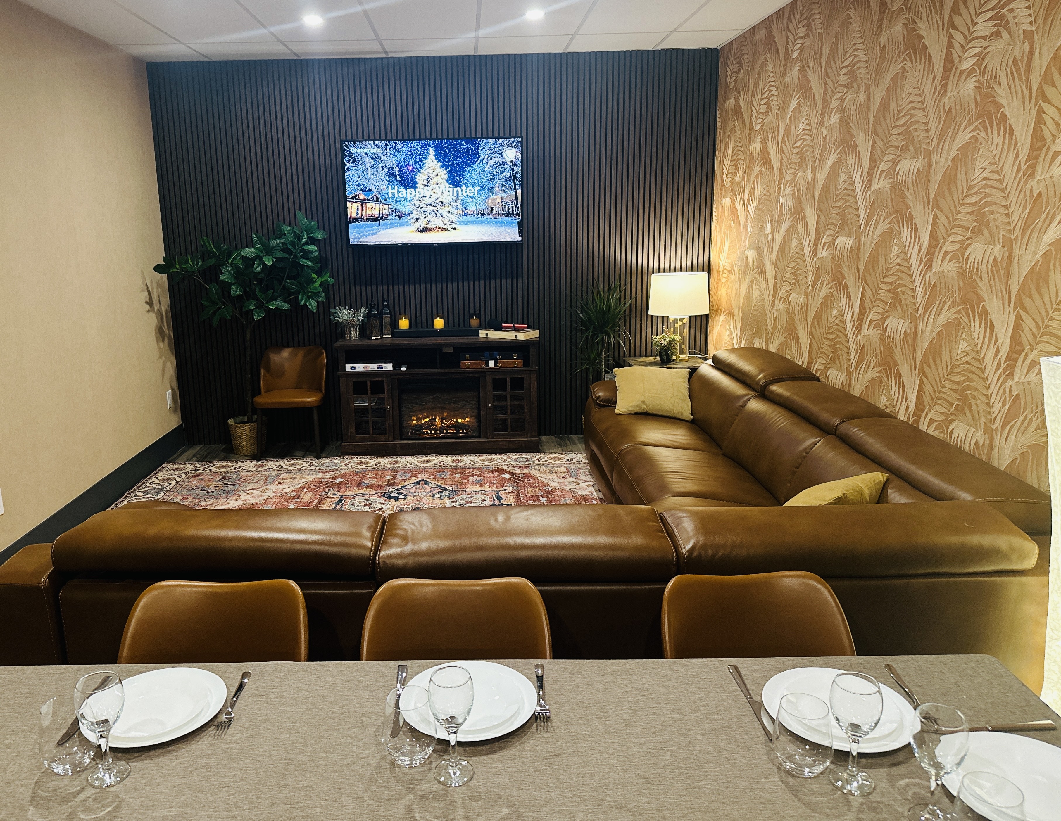 A comfortable private room with a large sofa, TV, tables for food and drinks.